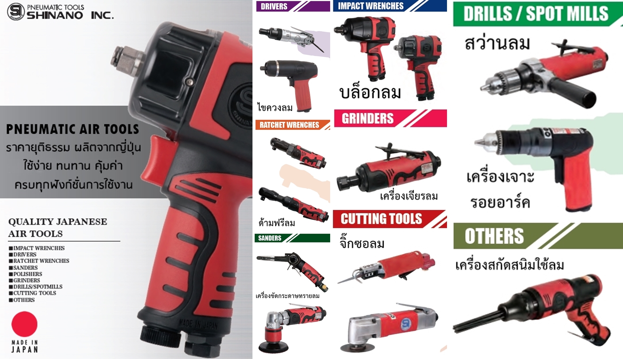 เครื่องมือใช้ลม แบรนด์ SHINANO ชินาโน่ ผลิตโดย SHINANO INC. จากประเทศญี่ปุ่น ทนทาน คุณภาพสูง ออกแบบเพื่อตอบสนองทุกฟังก์ชั่นการใช้งาน สำหรับช่างมืออาชีพ SHINANO pneumatic air tools / Made in JAPAN / Highest Quality / Worldwide Recognition / Practical & Ergonomic / High Quality Production โดยผู้แทนจำหน่ายอย่างเป็นทางการในประเทศไทย